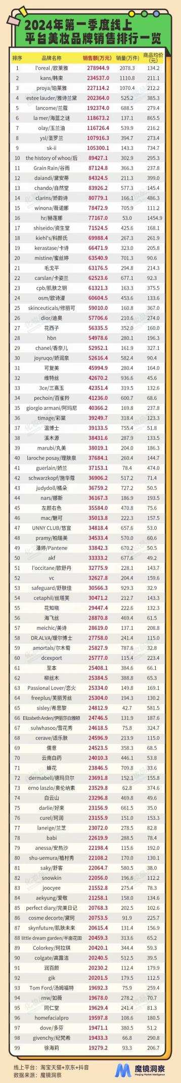 而另据魔镜洞察数据显示,今年第一季度,全网TOP99美妆品牌整体GMV达493.67亿元,正式冲击500亿。其中,上美股份(02145)旗下韩束凭借23.45亿元的销售额,成为三大主流线上平台国货美妆销售冠军。珀莱雅则以22.71亿元的销售额紧随其后。