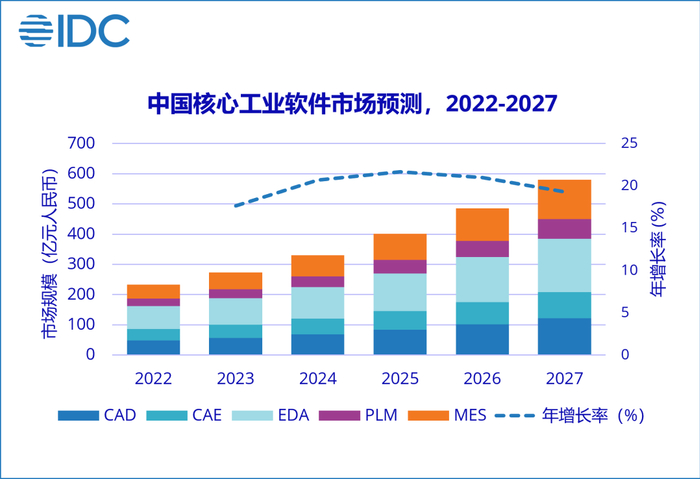 其中,中国核心工业软件(包含CAD、CAE、EDA、PLM、MES软件,不含咨询和实施服务)市场规模将从2023年的273.6亿元人民币增长到2027年的579.6亿元人民币,年复合增长率为20.0%。