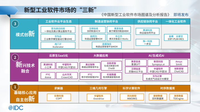 基于此,IDC启动《中国新型工业软件图谱及市场分析》研究,旨在研究归类近年来出现的各类新型工业软件形态和未来发展趋势。新型工业软件包括以下“三新”:基础核心应用自主创新、新兴技术融合以及模式创新。
