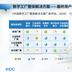 IDC提到,工业企业在建设数字工厂时,更倾向于面对一家整体解决方案服务提供商。它可以主导数字工厂规划,并能拉动其生态伙伴共同完成数字工厂建设。但此种建设方式对服务商的自身能力、生态能力也提出了较高的要求。根据IDC调研结果显示,工业软件产品组合和咨询能力是工业企业在选择合作伙伴时最看中的能力。