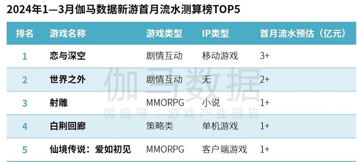 2024年1—3月,伽马数据新游首月流水测算榜TOP5中有4款不同IP类型改编产品。新游整体流水表现一般,对移动游戏市场规模的增长贡献有限。
