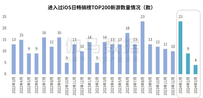2024年3月,进入过iOS日畅销榜TOP200的新游仅有4款,为近两年来最低。