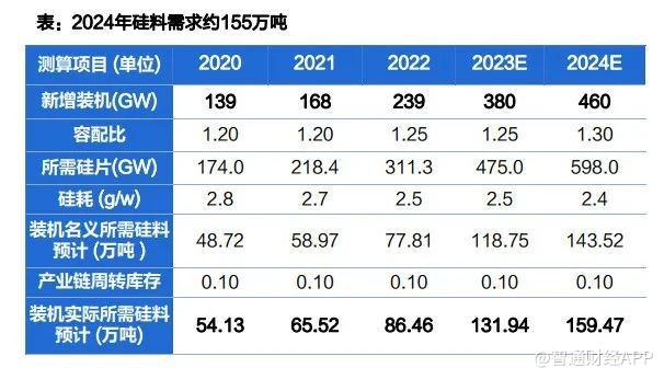 展望2024年,业内扩产脚步不停,产能过剩问题料将持续。据硅业分会统计,2024年仍有约123万吨新增产能投产,预计全年硅料产量或将达260万吨,而新增装机需求约160万吨。