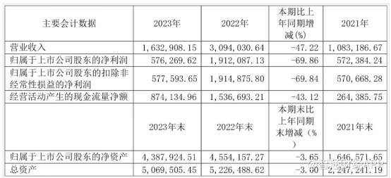 实际上,在此前披露的2023年全年业绩中,大全新能源各项财务指标已有大幅“缩水”。全年营业总收入163.29亿元,同比下降47.22%;归母净利润57.63亿元,同比下降69.86%;扣非净利润57.76亿元,同比下降69.84%。