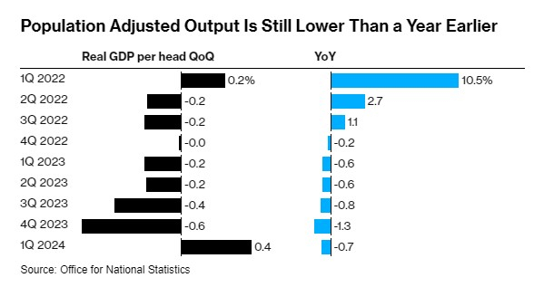 今年前三个月,人均产出增长0.4%,结束了连续七个季度没有正增长的局面。即便如此,人均GDP估计仍比上年同期低0.7%。