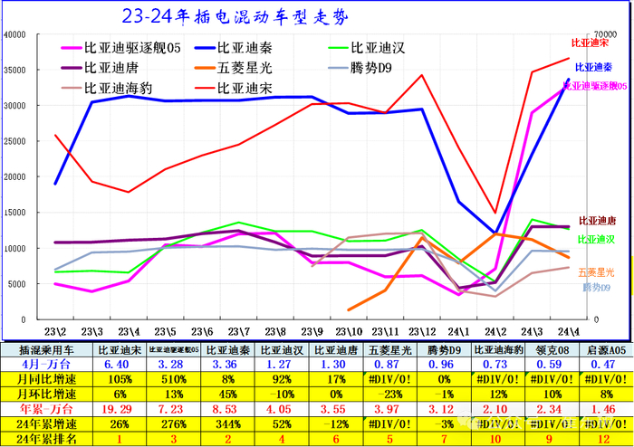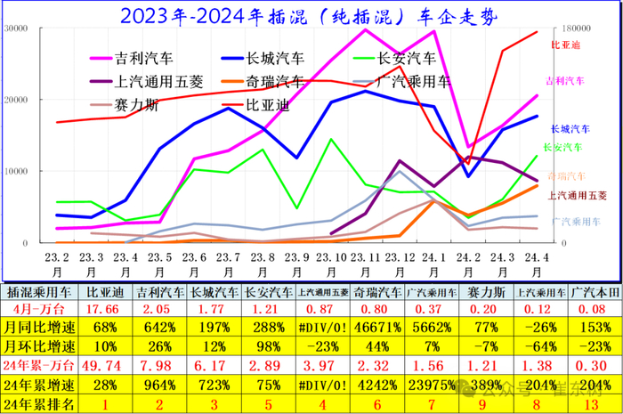 2024年4月份插电混动市场走势分化,主要的厂家是比亚迪处于绝对领先,比亚迪由于销量较高,放到右轴。吉利汽车、长城汽车、长安汽车、上汽通用五菱等跟进比亚迪发展插混,比亚迪降价后的竞品积极跟进。近期吉利和长城新品的插混产品很有竞争力。