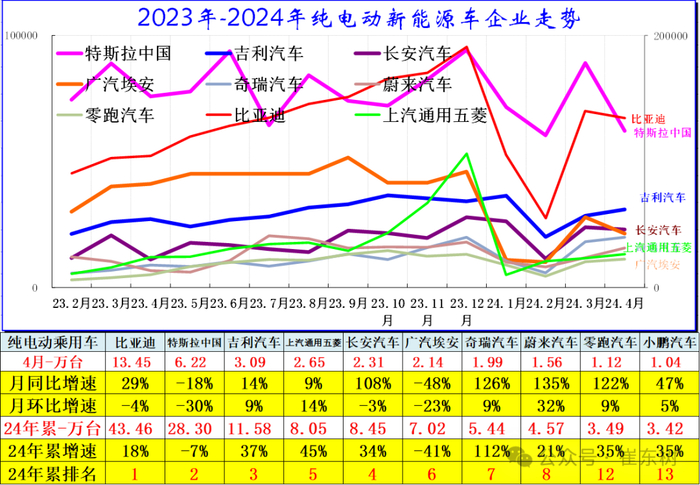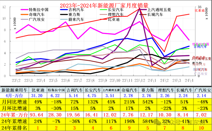 2024年国内新能源格局激烈变化,头部效应日益明显,高端相对较强。自主车企较强,新势力总体较好,吉利、五菱、长安等传统车企新能源4月走势很强。