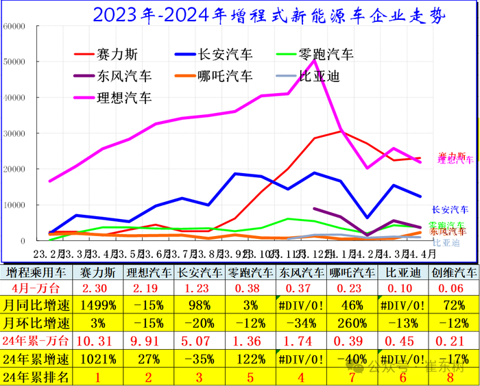 增程式新能源车企业近期表现超强,理想与赛力斯等部分车企出现阶段性爆发增长特征。本月的理想的増程回落较大。长安和哪吒等増程产品持续较快增长。