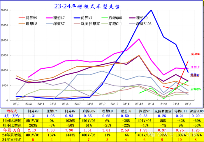 2024年4月的主力车型从理想独占变成赛力斯的问界领军,主力车型市场竞争逐步激化,万台以上月销的车型已经有充分竞争,长安系增长也很好。