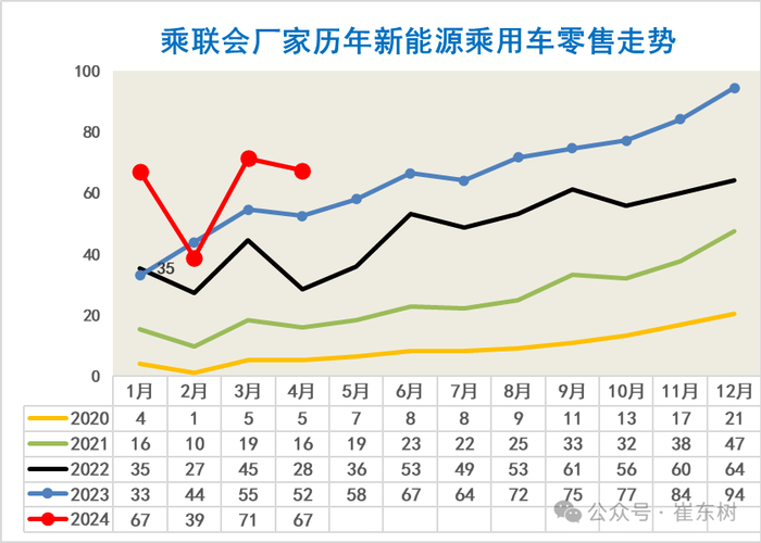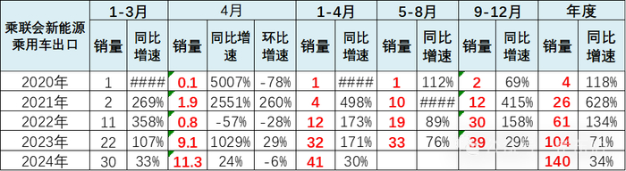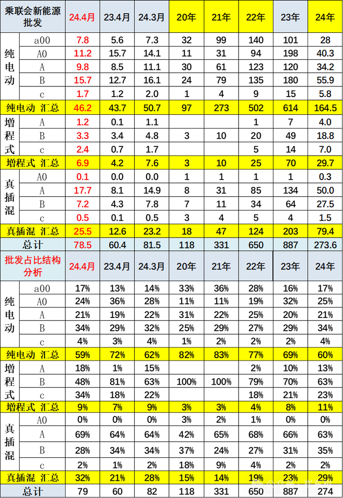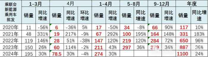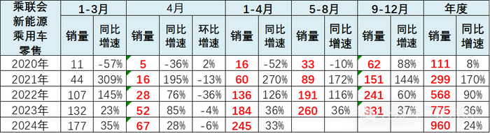 2023年累计零售775万辆,同比增长36%。2024年1-4月的新能源车的零售245万辆增33%走势相对较稳,持平于2023年的36%增速,这是很不错的表现。