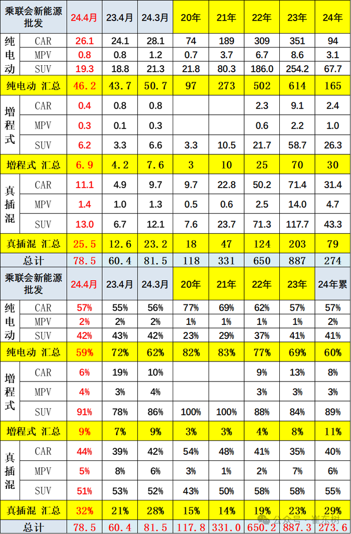 2024年4月纯电动车的SUV占比达到42%,而增程式中SUV的占比达到91%,真插混新能源车的SUV占比达到51%,形成纯电动SUV占比最低,而增程式SUV占比最高的差异化的特征,这样也推动整个新能源车市从SUV向轿车市场延伸的产品增量空间。