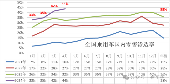 崔东树:4月新能源车国内零售渗透率43.7% 较去年同期提升12个百分点