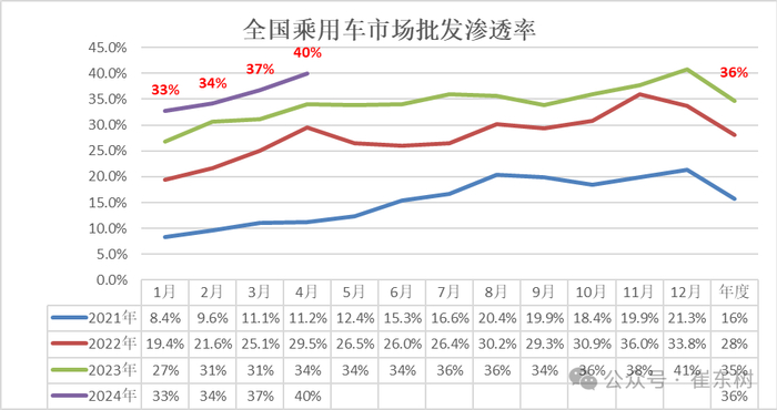 4月新能源车厂商批发渗透率40%,较2023年4月的34%的渗透率提升6个百分点。