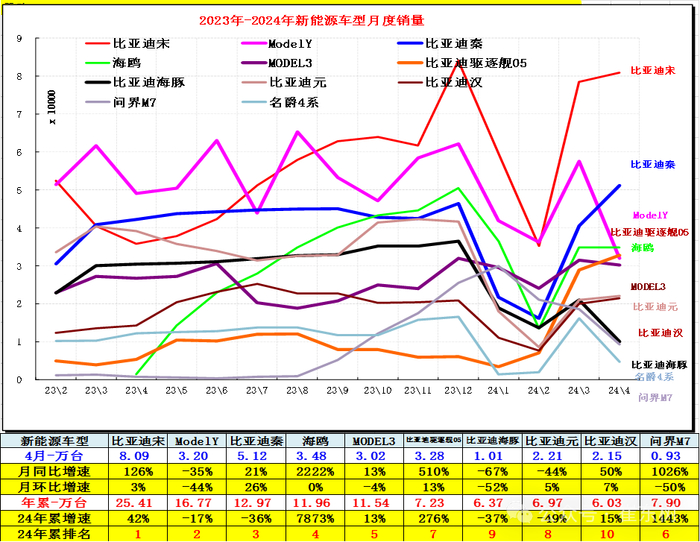 2024年4月纯电动车型表现相对较强的是特斯拉MODELY、海鸥、MODEL3、比亚迪海豚、比亚迪元等产品。