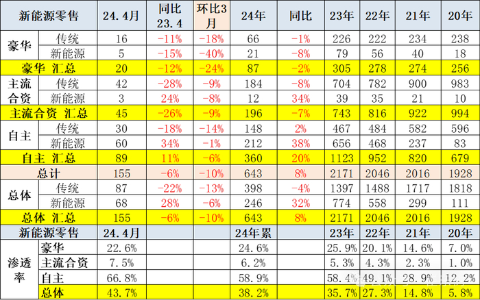4月,自主品牌新能源车渗透率53.6%;豪华车中的新能源车渗透率31.5%;而主流合资品牌新能源车渗透率仅有6.8%。
