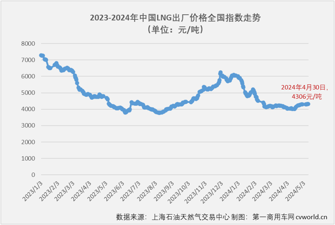 另一方面,影响天然气重卡市场的另一大因素——气价在2024年的走势也很“友好”。2023年12月,LNG平均气价接近6000元/吨左右,天然气重卡的经济性优势在2023年年末下降了许多;2024年1月份,天然气价格小幅下降(约5300元/吨),之后的2、3、4月LNG批发价格继续下降,4月份气价最低时仅有4000元出头/吨,月底气价有所回升(如下图),但仍算是一个非常友好的价格,这对燃气重卡购车意愿有明显的刺激作用,3月份和4月份连续两个月超2.6万辆的销量,也印证了气价对燃气重卡的刺激作用。