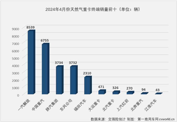 第一商用车网注意到,2024年1月份和2月份,天然气重卡市场销量超千辆企业数分别仅有2家和4家,而在最近的3月份和4月份,这一数字达到5家。4月份,解放、重汽、陕汽、东风和福田5家企业销量均超2000辆,其中排名首位的解放月销量继续超过8000,达到8539辆,月度份额达到32.4%(今年1-4月,解放在天然气重卡市场的月度份额均超30%),解放以极其强势的表现继续蝉联天然气重卡市场月榜冠军。
