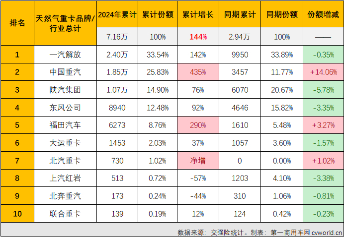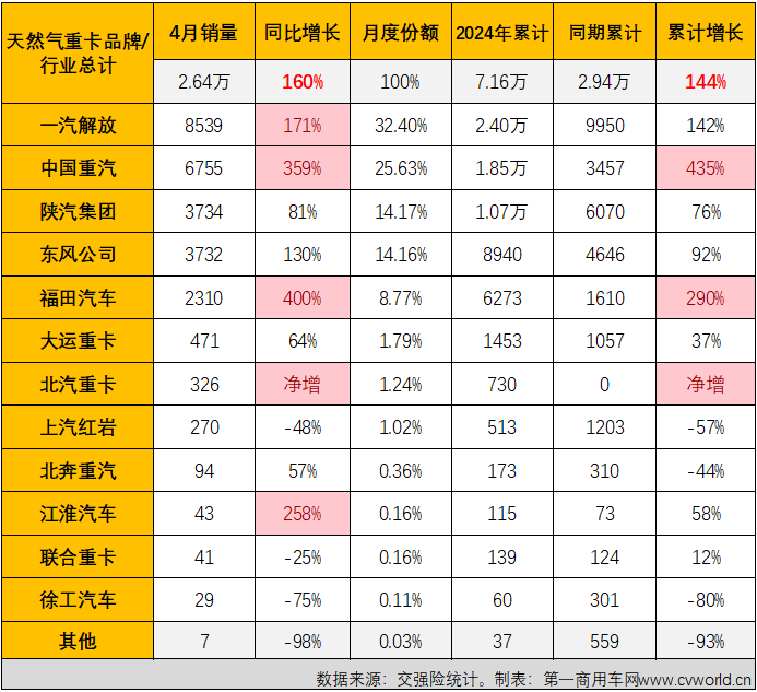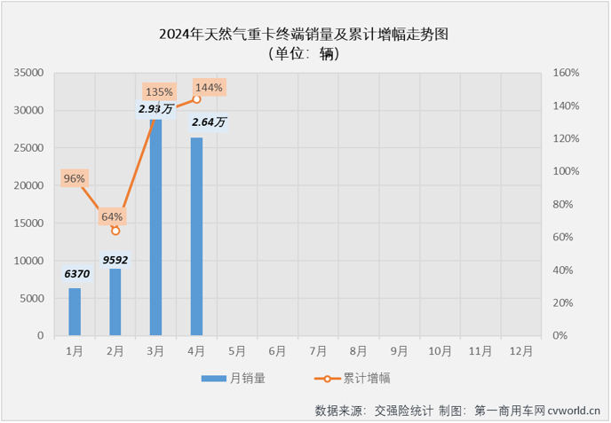 2024年1-4月,国内天然气重卡市场累计销售7.16万辆,同比增长144%,累计销量增幅较3月过后(+135%)扩大9个百分点,比2023年1-4月累计多销售约4.22万辆。