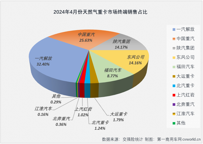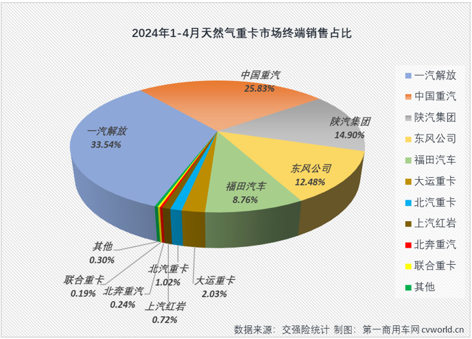2024年4月过后,天然气重卡市场又有企业累计销量破万,目前排名前三位的解放、重汽和陕汽累计销量分别达到2.4万辆、1.85万辆和1.07万辆,其中排名前两位的解放和重汽累计份额双双超过25%,分别达到33.54%和25.83%,两家企业合计分食了今年1-4月天然气重卡市场接近6成的份额(59.37%),陕汽累计份额也接近15%,达到14.9%;东风和福田1-4月累计销量分别为8940辆和6273辆,市场份额分别达到12.48%和8.76%;累计销量排名第6的大运今年1-4月销售天然气重卡1453辆,市场份额为2.03%;北汽重卡以累销730的表现暂列行业第7位,市场份额为1.02%,其他企业市场份额均低于1%。