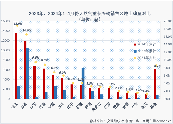从终端销售区域来看,2024年1-4月,全国共有30个省(市、自治区)有天然气重卡挂牌上路,区域分布仍呈现极不均衡的状态,河北、山西、山东、河南等资源型物流运输大省,“接收”了今年前四月天然气重卡终端市场大部分销量(如下图),今年1-4月终端区域销量前两位的河北和山西占比分别达到18.9%和16.6%,今年1-4月河北和山西分别有1.35万辆和1.19万辆天然气重卡挂牌上路;山东、河南、宁夏和四川分列上牌量第3-6位,1-4月分别有6793辆、6269辆、4950辆和4327辆天然气重卡挂牌,占比分别为9.5%、8.8%、6.9%和6%;排名区域上牌量第7-11位的辽宁、新疆、陕西、内蒙古和江苏今年1-4月天然气重卡的上牌量也超过2000辆,占比均超3%。