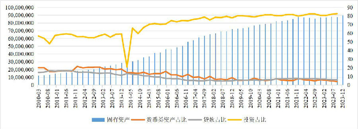 截至2023年4季度末,信托公司固有资产规模达到8959.39亿元,比2023年3季度增加203亿元,增速2.31%;与2022年同期相比,规模增加217亿元,同比增速2.48%。从固有资产的运用结构来看,投资是固有资产运用的主力。从长期变化趋势来看,2017年以后,受行业发展环境影响,信托公司固有资产投资增速稳步放缓。