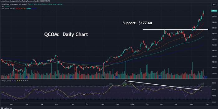 最后,根据日线图,这样就可以在主要形势不正确的情况下确定可能的下行支撑水平,股价开始从这里急剧逆转。具体来说,分析师已经将2024年3月177.60美元附近的高点概述为看跌的下行目标。正如我们所看到的,这个价格水平也与50天指数移动平均线一致,如果高通的价格回落到每股200美元以下,这使得该水平作为潜在下行目标的有效性增加。然而,有一个因素似乎使这种看跌的结果不太可能出现,那就是每日RSI读数的下降趋势被打破。但是,与此同时,这些指标已经进入超买区域——这告诉我们,在高通能够继续恢复更广泛的上升趋势之前,该股最近的上涨可能需要一段时间的盘整(甚至是下行修正回调)。
