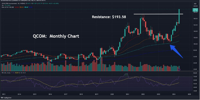 总的来说,这些季度数据相当令人鼓舞——看到高通股价继续走高并不完全令人惊讶。然而,该股目前上升趋势的强劲势头可能会让一些投资者感到惊讶,因为已经突破了月线图上重要的长期阻力位。具体来说,技术分析师已经将高通公司2022年1月的高点概述为该股的主要长期阻力位,我们可以从上图中看到,目前的上涨趋势在本月创下历史新高方面相对较少。考虑到2024年5月蜡烛图形态的强度,分析师认为该股飙升的看涨势头有可能持续下去。在相对强弱指数(RSI)的月度指标读数中可以找到指向这一积极方向的进一步证据,该指数尚未达到严重超买区域。此外,股价能够在100个月指数移动平均线附近找到强有力的支撑,分析师认为这种类型的价格行为可以限制股价未来的潜在下跌。