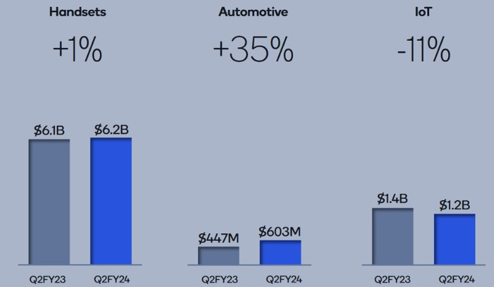 至于高通,大部分注意力往往集中在该公司的手机业务上。高通公布的手机销售额为61.8亿美元(表明该期间的年化增长率为1%),这在很大程度上表明,在疫情后出现各种疲软情况后,这部分市场的趋势可能正在企稳。也许最令人惊讶的是高通与中国智能手机制造商相关的销售数据,该季度中国市场的年化增长率约为40%。高通的汽车业务也出现了类似的增长,销售额为6.03亿美元,这表明该季度的增长率为35%。不利的一面是,该公司的物联网收入在本季度下降了11%(12.4亿美元),表明虚拟现实产品中使用的较便宜的处理组件和处理器的销售疲软。