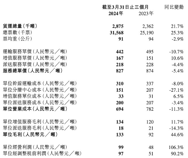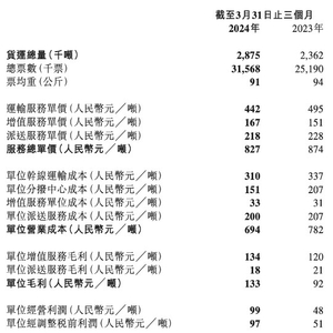 从财报披露的单位经济效益来看,2024年第一季度,安能物流的运输服务单价同比下降了10.7%,派送服务单价同比下降了4.4%,仅增值服务单价同比增加了4.4%,综合下来,服务总单价为827元/吨,同比减少了5.4%。