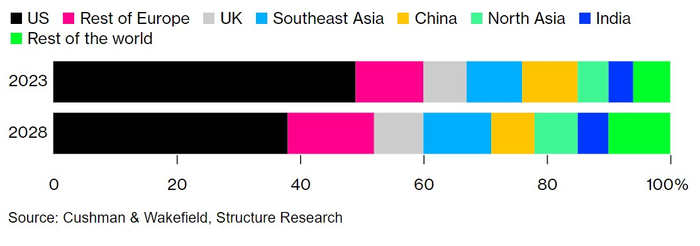 这意味着需要更多的数据中心来存储和处理内容创建者、公司和客户之间传递的大量信息。根据Cushman & Wakefield的数据,到2028年,东南亚和北亚的数据中心需求预计将以每年约25%的速度增长。相比之下,美国的年增长率为14%。到2028年,东南亚将成为全球第二大(仅次于美国)的数据中心收入来源。