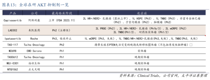 从全球研发格局审视,AKT抑制剂研发是极具潜力而不拥挤的蓝海赛道,目前只有阿斯利康的Capivasertib获批上市,而来凯医药(02105)的LAE002(Afuresertib)进度全球第二,中美两地已进入临床三期,两大领军企业进度远远甩开其他公司,中短期内是“绝代双骄”的竞争格局。