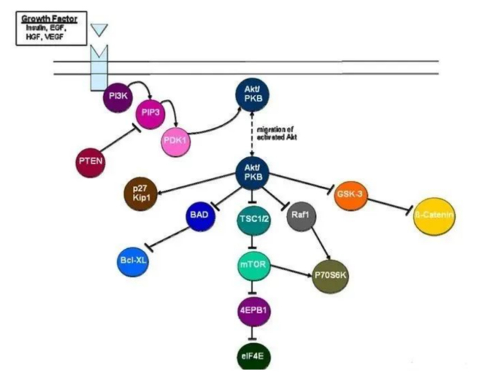AKT是一种丝氨酸/苏氨酸蛋白激酶,为PI3K/AKT/mTOR信号级联的关键节点。AKT可以激活下游的效应分子(主要是mTOR蛋白),进而刺激肿瘤细胞的代谢生长和增殖、免疫逃逸和血管生成。其中AKT的激活过程可以被PTEN抑制,PTEN功能的缺失将导致AKT的过度激活,引起肿瘤的发生。由此,通过抑制AKT的激活,可达到治疗癌症的效果。