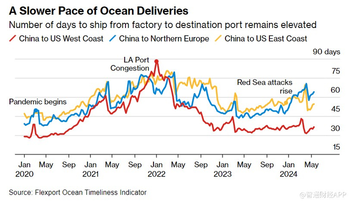 从中国运往欧洲和美国东海岸的货物运输时间特别长,因为这些航线上的大多数船只都避开了苏伊士运河这条捷径。