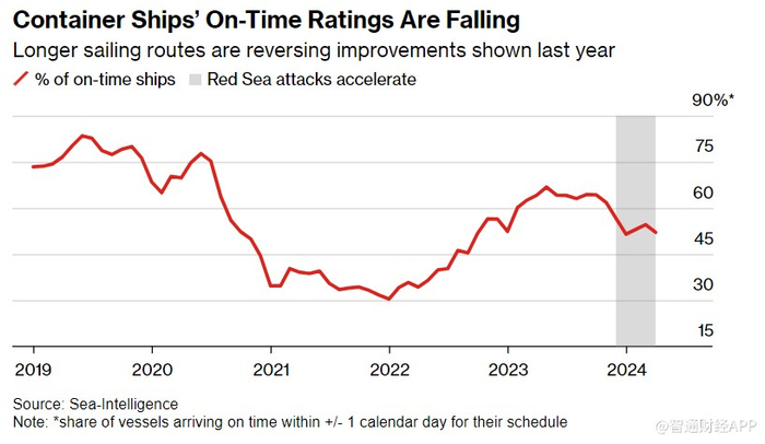 随着船舶停泊时间增加,航程也延长,为这些服务付费的供应链经理不得不提前下订单。Sea-Intelligence的数据显示,集装箱船的准点率已降至52%左右,与2022年初疫情期间约30%的低点相比,去年的改善幅度已大幅收窄。