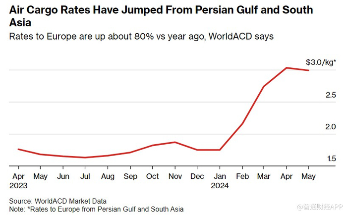 总部位于阿姆斯特丹的WorldACD的产品开发总监Rogier Blocq表示,从波斯湾和南亚到欧洲的航空货运价格5月份同比上涨了近80%。这在同期全球平均价格增长约3%的情况下显得尤为突出。