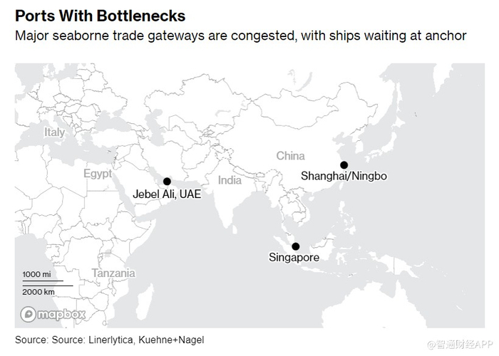 船只绕行正加剧新加坡等港口的拥堵。阿联酋的杰贝阿里港也面临拥堵问题,因为它靠近红海,而且它是通过迪拜的海运和空运货物的主要转运中心。
