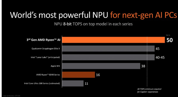 而在AIPC最核心的NPU性能方面,全新Ryzen AI 300系列处理器一举超越英特尔与高通,成为当今最强NPU。高通骁龙X Elite NPU的算力为45TOPS,Intel即将推出的下一代酷睿Ultra Lunar Lake NPU算力同样是45TOPS,Ryzen AI 300系列则高达50TOPS。更强力的NPU,配合AMD性能强劲的CPU与GPU,可以在多重应用场景中部署更高级别参数的端侧AI大模型。