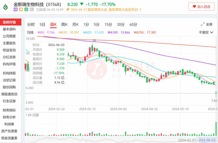 二级市场方面,受到地缘政治因素带来的负面影响,6月3日盘中,金斯瑞(01548)股价低开低走,最大跌幅达到25.7%,当日成交量达1.12亿股,成交额达8.94亿港元,创下自2021年以来金斯瑞的单日成交额记录。