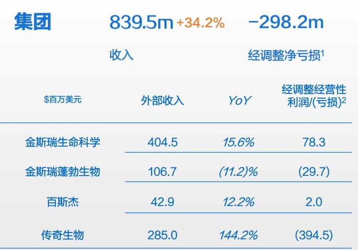 2023年,在金斯瑞总计8.4亿美元的营收中,对应CRO业务的生命科学服务及产品业务收入达4.05亿美元,占比为48.18%,为金斯瑞的主要收入来源。此外,生命科学业务不仅是金斯瑞生物的营收担当,而且也是金斯瑞最为关键的主要现金流来源。在2023年,传奇生物和蓬勃生物依然处于持续亏损中,但生命科学业务却贡献了7830万美元利润。