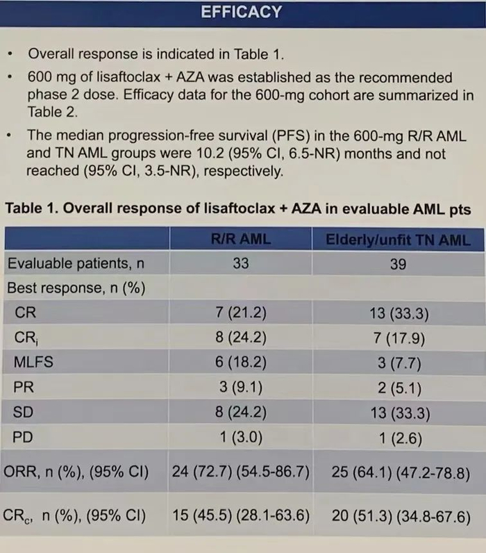 新型Bcl-2抑制剂APG-2575(Lisaftoclax)联合阿扎胞苷治疗初治或复发/难治急性髓性白血病患者的有效性和安全性