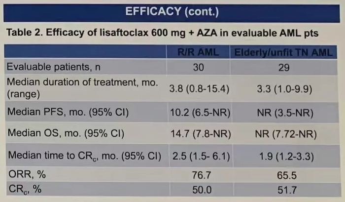 在所有经APG-2575联合AZA治疗的R/R AML患者中,总体反应率(ORR= CR + CRi + 形态学无白血病状态[MLFS] + PR)为72.7%,复合完全缓解率(CRc = CR+ CRi)为45.5%。600mg剂量组(n=30)的中位治疗持续时间为3.8个月,ORR为76.7%,CRc为50.0%;达到CRc的中位时间为2.5个月;中位PFS为10.2个月;中位总体生存期(OS)为14.7个月。
