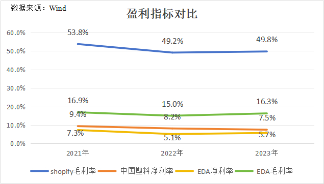 从目前的股价及业绩表现来看,EDA口中的SaaS只是为提升估值讲的一个故事。2023年,集团毛利率、净利率只有16.3%和5.5%,别说和Shopify比,连属于制造行业的母公司中国联塑都比不过,显然不是SaaS该有的水平。