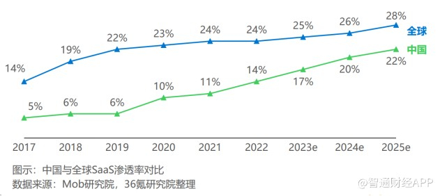 随着近年来数字经济的发展,SaaS(软件即服务)模式在国内也逐步普及,发展前景长期向好。根据36氪研究院出品的《2023年中国企业级SaaS行业发展研究报告》,2023年中国SaaS市场规模为754亿元,平均毛利率为57%,中国SaaS渗透率在2023年达到17%,虽然与全球SaaS渗透率比还有一定差距,但保持每年2%-3%的稳定增长。