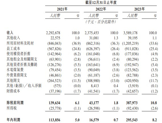 财务方面,于2021年、2022年以及2023年,绿茶集团实现收入分别约为22.93亿元、23.75亿元、35.89亿元;年内利润分别约为1.14亿元、1657.9万元、2.96亿元。