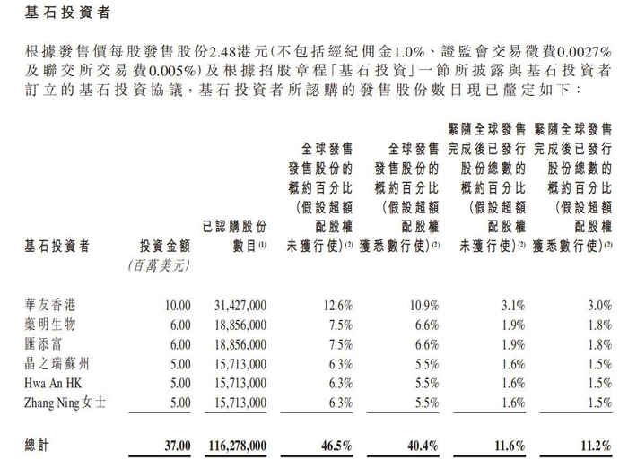 基石投资者是华友钴业、药明生物、汇添富、半导体的晶之瑞,以及两位个人投资者,这几位共持有IPO发行后总股本的11.2%(假设算上公司股权激励授予增发),共1.16亿股。