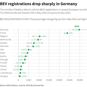 根据欧洲汽车行业机构周四发布的最新数据显示,5月份欧盟新型电动汽车销量同比下降12%,德国市场更是出现了30%的显著下滑。这一变化的背后,是德国在去年12月提前终止了购买电动汽车的补贴政策,此举作为2024年预算协议的一部分,已经导致德国今年迄今为止电动汽车销量下降16%。