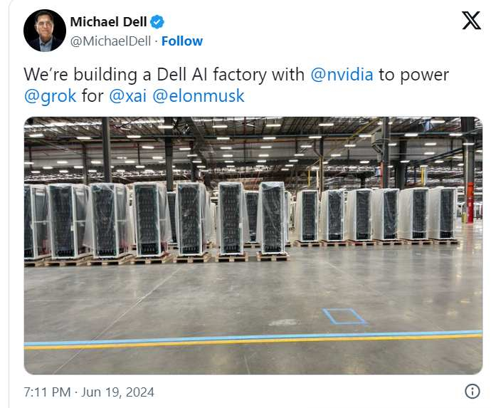戴尔科技公司首席执行官迈克尔·戴尔(Michael Dell)对上述消息评论道,该公司将与英伟达(NVDA.US)一起为马斯克创立的xAI建立一个“戴尔人工智能算力工厂”。随后戴尔科技公司的股价在盘前交易中上涨。“我们正在与AI芯片领导者英伟达合作一起建设戴尔人工智能工厂,为xAI的Grok大模型提供驱动力。”迈克尔•戴尔周三在一篇X帖子中回复道。