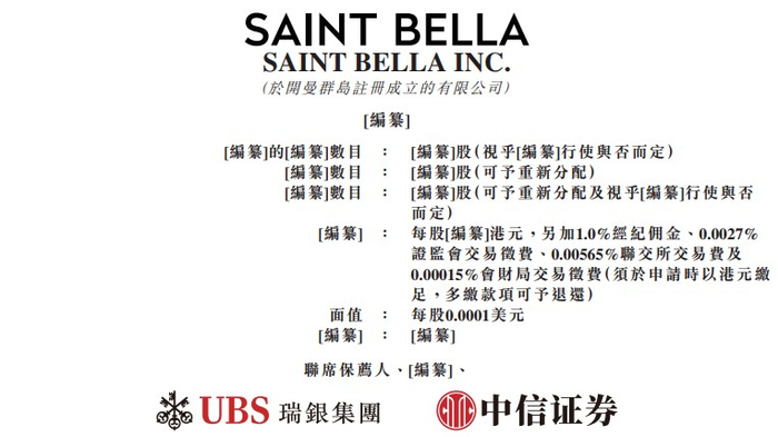 港交所6月25日披露,SAINT BELLA INC. (圣贝拉)向港交所主板提交上市申请,瑞银集团和中信证券为其联席保荐人。