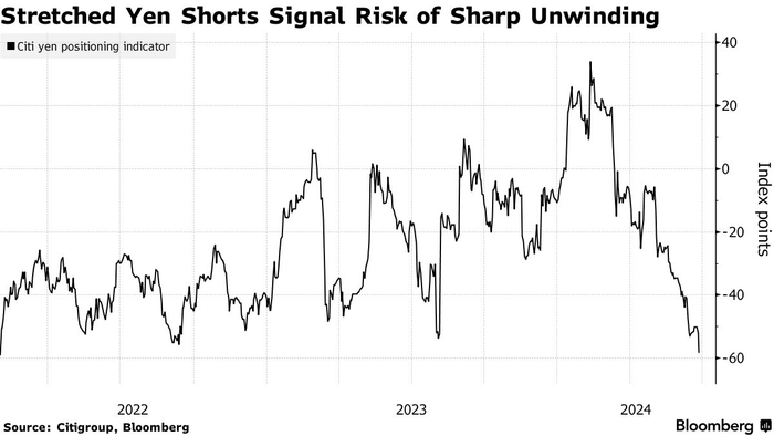 花旗集团 (Citigroup Inc.)编制的一项衡量日元活跃交易员持仓的指标已降至 2022 年以来的最低水平,此前日元空头押注激增。虽然这表明交易员们仍然坚定看跌,但也表明如果日元突然走强,可能需要迅速平仓大量头寸。