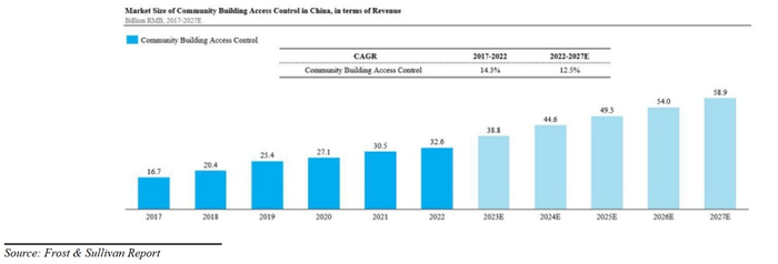 从行业角度看,Frost&Sulliva表示,疫情加速了智慧城市和智慧社区的建设,社区建设门禁需求旺盛,得益于居民对住宅安全要求的提高、智慧城市及智慧社区的发展、政策的鼓励以及相关技术的不断突破,Frost&Sulliva预计我国社区建筑门禁的市场规模有望从2022年的326亿增至2027年的589亿元,年复合增速12.5%。